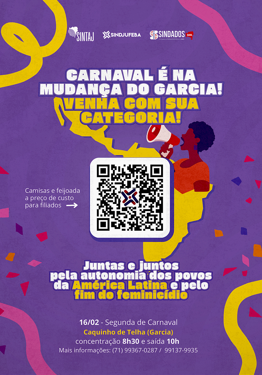 No dia 16 de fevereiro, em parceria com os sindicatos, SINTAJ/Ba e Sindjufe/Ba, e os movimentos sociais, o Sindados/Ba, participará na Mudança do Garcia, com os temas: “Autonomia dos povos e defesa da América Latina” e “Mulheres vivas e sem medo: chega de feminicídio !”.